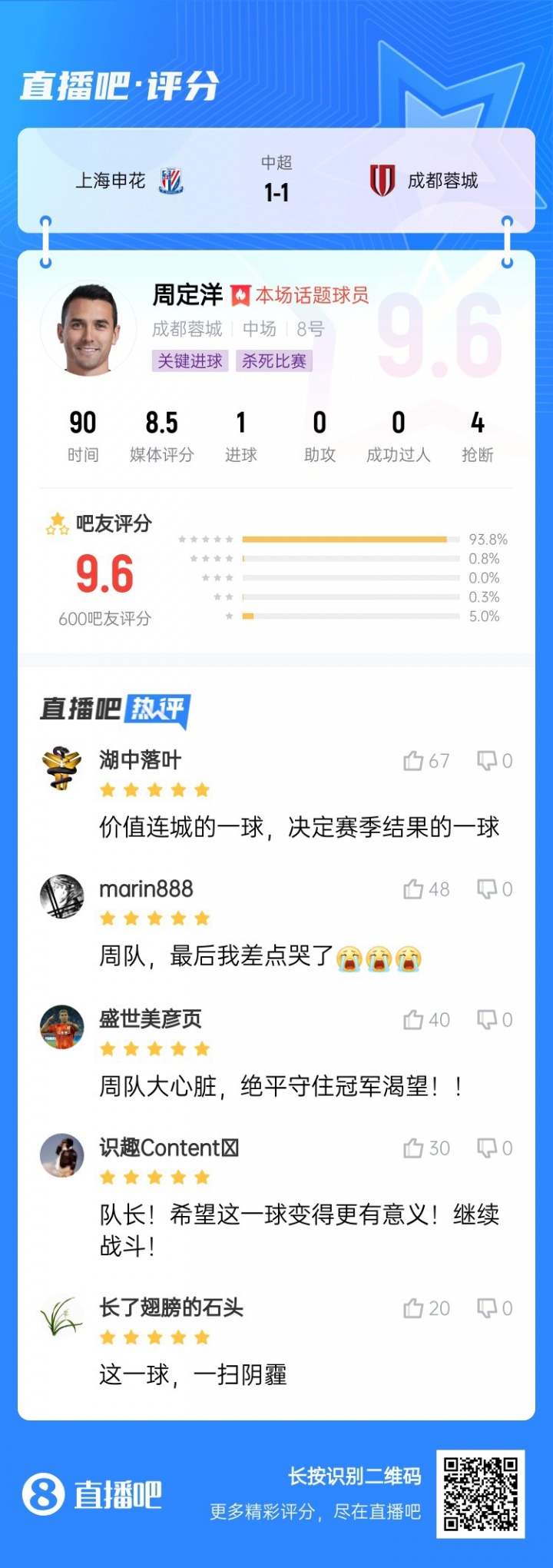 在本轮中超争冠天王山战中,周定洋第99分钟读秒绝平,这粒价值千金的进球,帮助蓉城在客战申花的艰难战役中抢下一分,守住联赛榜首位置。