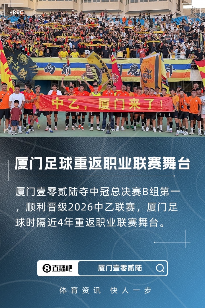 中冠决赛阶段分组赛B组,厦门壹零贰陆7轮5胜2平夺得B组第一,获得参加2026中乙联赛的资格,厦门足球时隔近4年重返职业联赛舞台!